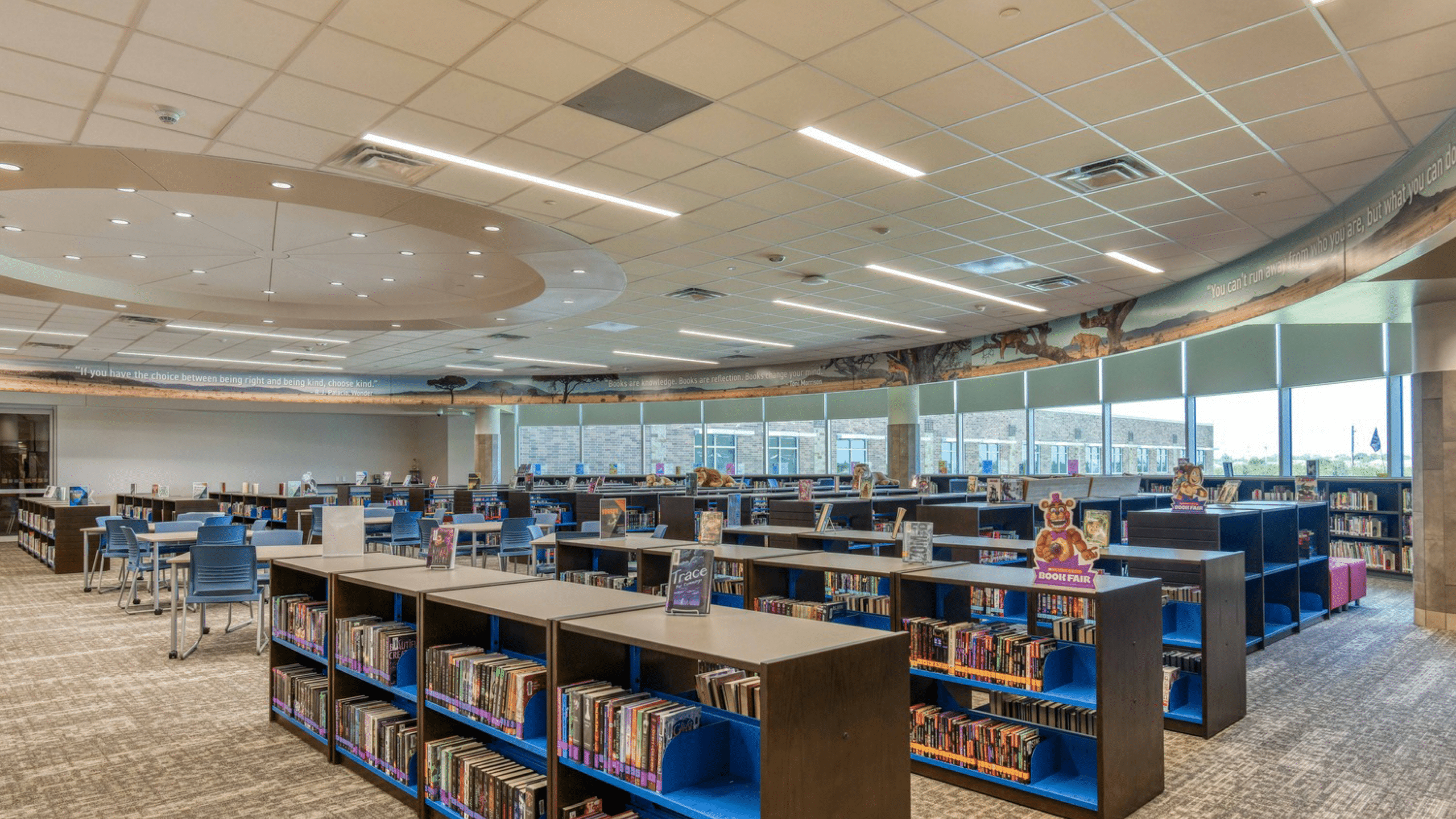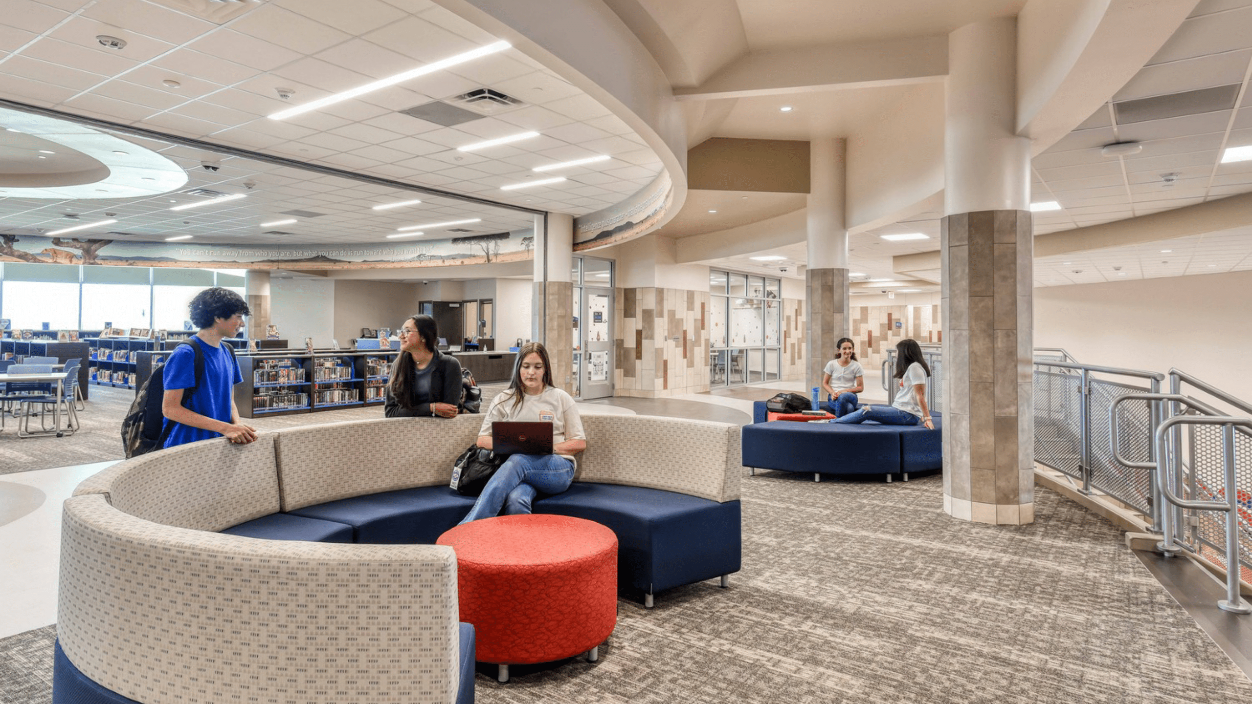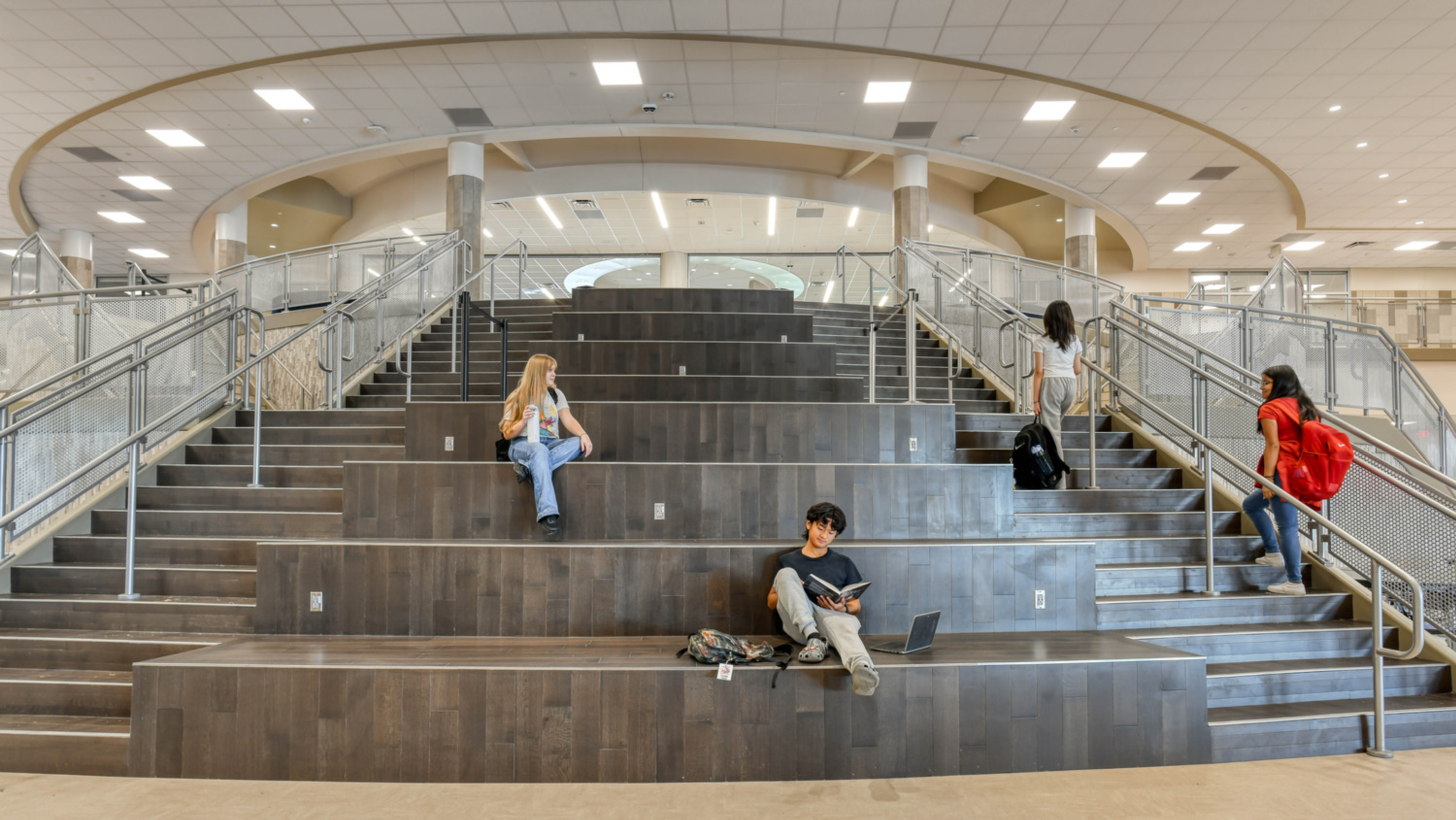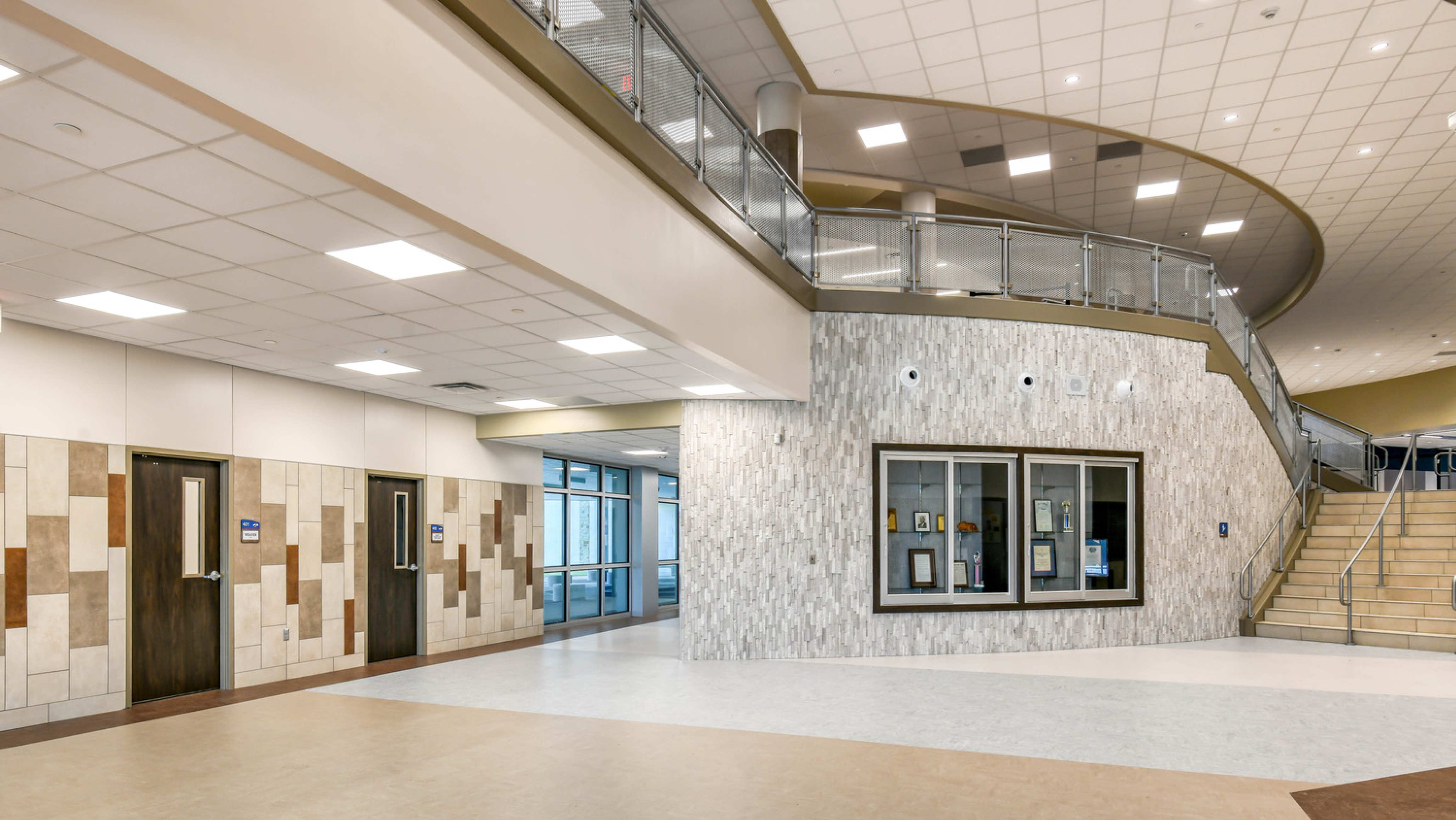 Traditional classrooms and flexible spaces are found throughout the new school to facilitate the district’s 21st-century learning initiatives. The focal point is a large, multifunction open area that serves as the cafeteria and venue for performances and gatherings. This space is distinguished by a curved learning stair that provides overflow seating for dining and events or the perfect setting for a variety of activities. At the top of the stair is a library offering study areas, makerspace and abundant views of outdoor vistas.